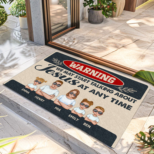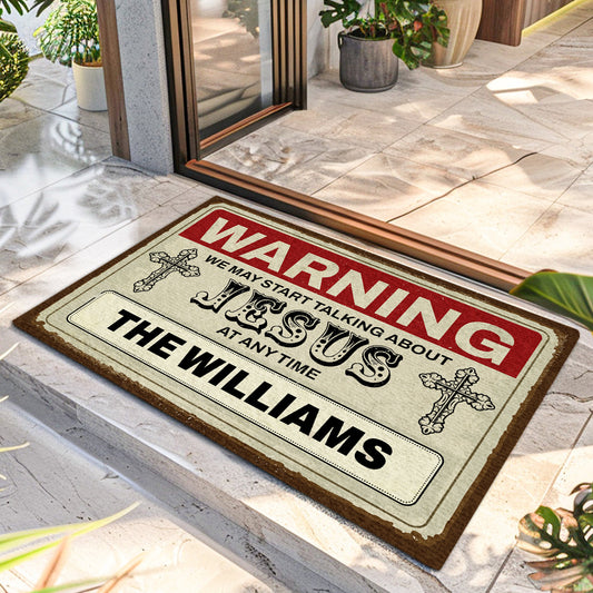 Warning We Talk About Jesus At Any Time | Personalized Doormat JSDMHLTN1765M