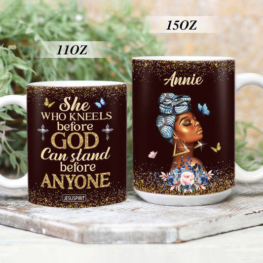Special Personalized White Ceramic Mug - She Who Kneels Before God Can Stand Before Anyone NUM484