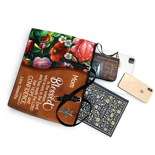 Meaningful Personalized Large Leather Tote Bag - Blessed Is The Woman Who Trusts In The Lord NUHN374
