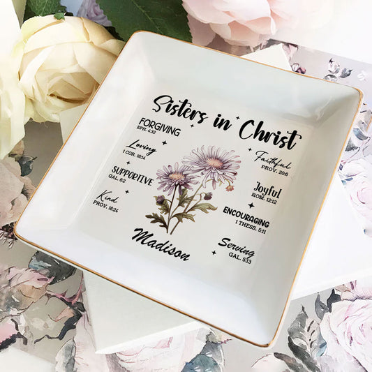 Sisters in Christ Loving 1 Cor. 16:14 Birth Month Flower | Personalized Jewelry Dish