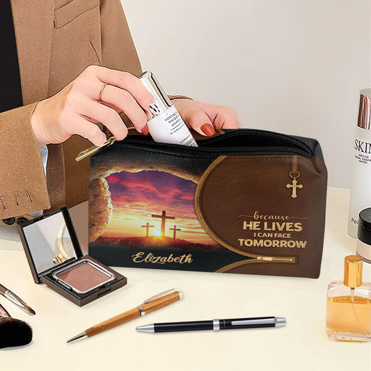 Jesuspirit | Inspirational Gift For Her | Personalized Zippered Leather Pouch | Because He Lives, I Can Face Tomorrow NUH267