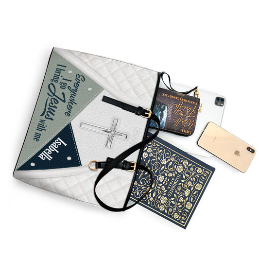 Everywhere I Go, I Bring Jesus With Me - Lovely Personalized Large Leather Tote Bag HHN370