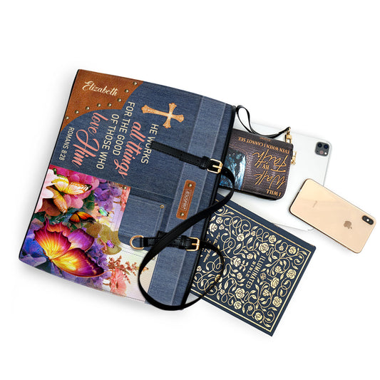 Personalized Large Leather Tote Bag - He Works All Things For The Good Of Those Who Love Him NUM315