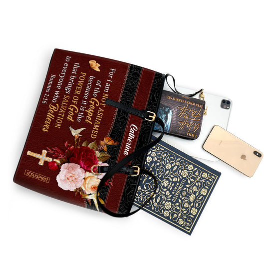 Pretty Personalized Large Leather Tote Bag - For I Am Not Ashamed Of The Gospel NUM467