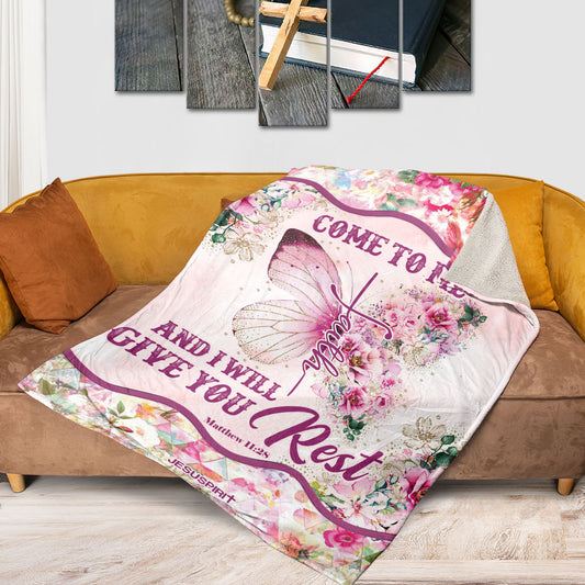 Jesuspirit Gorgeous Fleece Blanket | Flower And Butterfly | Matthew 11:28 | Come To Me And I Will Give You Rest FBHN613