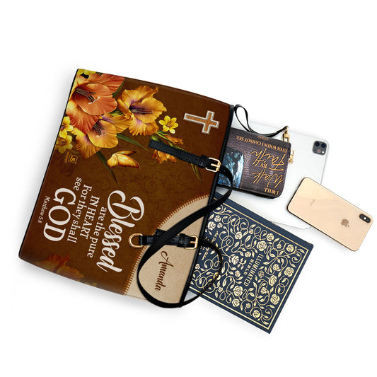 Jesuspirit | Matthew 5:8 | Blessed Are The Pure In Heart | Personalized Large Leather Tote Bag | Flower And Butterfly LLTBHN609