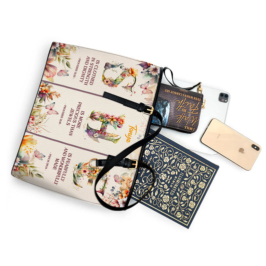 Jesuspirit | Proverbs 31:25 | Personalized Large Leather Tote Bag With Long Strap | Christ Gifts For Women Of God | She Is Clothed With Strength And Dignity LLTBM801