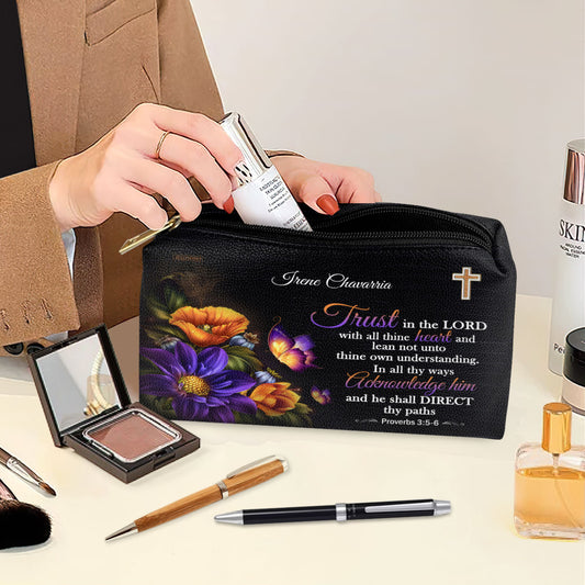 Jesuspirit | Proverbs 3:5-6 | Butterfly & Flower | Trust In The Lord With All Thine Heart | Spiritual Gifts For Her | Personalized Leather Pouch With Zipper H22