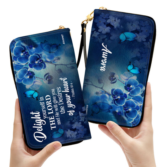 Jesuspirit | Psalm 37:4 | Personalized Leather Clutch Purse | Delight Yourself In The Lord | Blue Orchids And Lilac CPH47