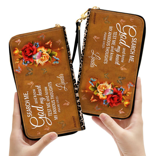 Jesuspirit | Personalized Zippered Leather Clutch Purse | Psalm 139:23 | Rose And Butterfly | Religious Gifts For Christian Women CPH730
