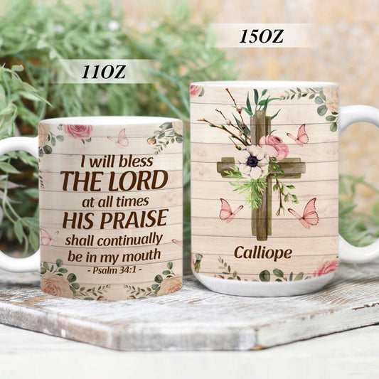 Jesuspirit | I Will Bless The Lord At All Times | Psalm 34:1 | Personalized White Ceramic Mug | Cross & Butterfly H28