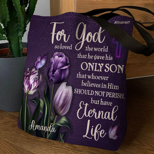 Jesuspirit | Beautiful Purple Personalized Tote Bag | For God So Loved The World | Tulip And Butterfly TBHN26