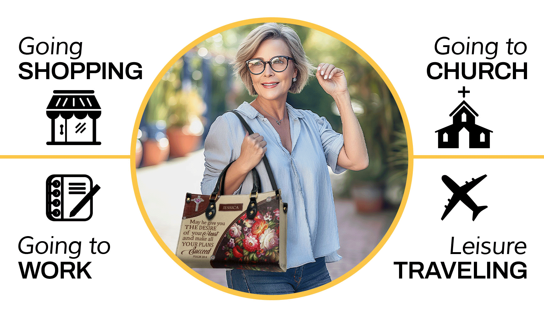 Jesuspirit's Personalized Leather Handbag intertwines faith and fashion, creating an uplifting accessory for Christian women. Adorned with meaningful Bible verses, each handbag carries a piece of your faith journey wherever you go. It's a profound reminder of love and strength within you. Perfect for yourselfor as a heartfelt religious gift for Christian ladies on special occasions.