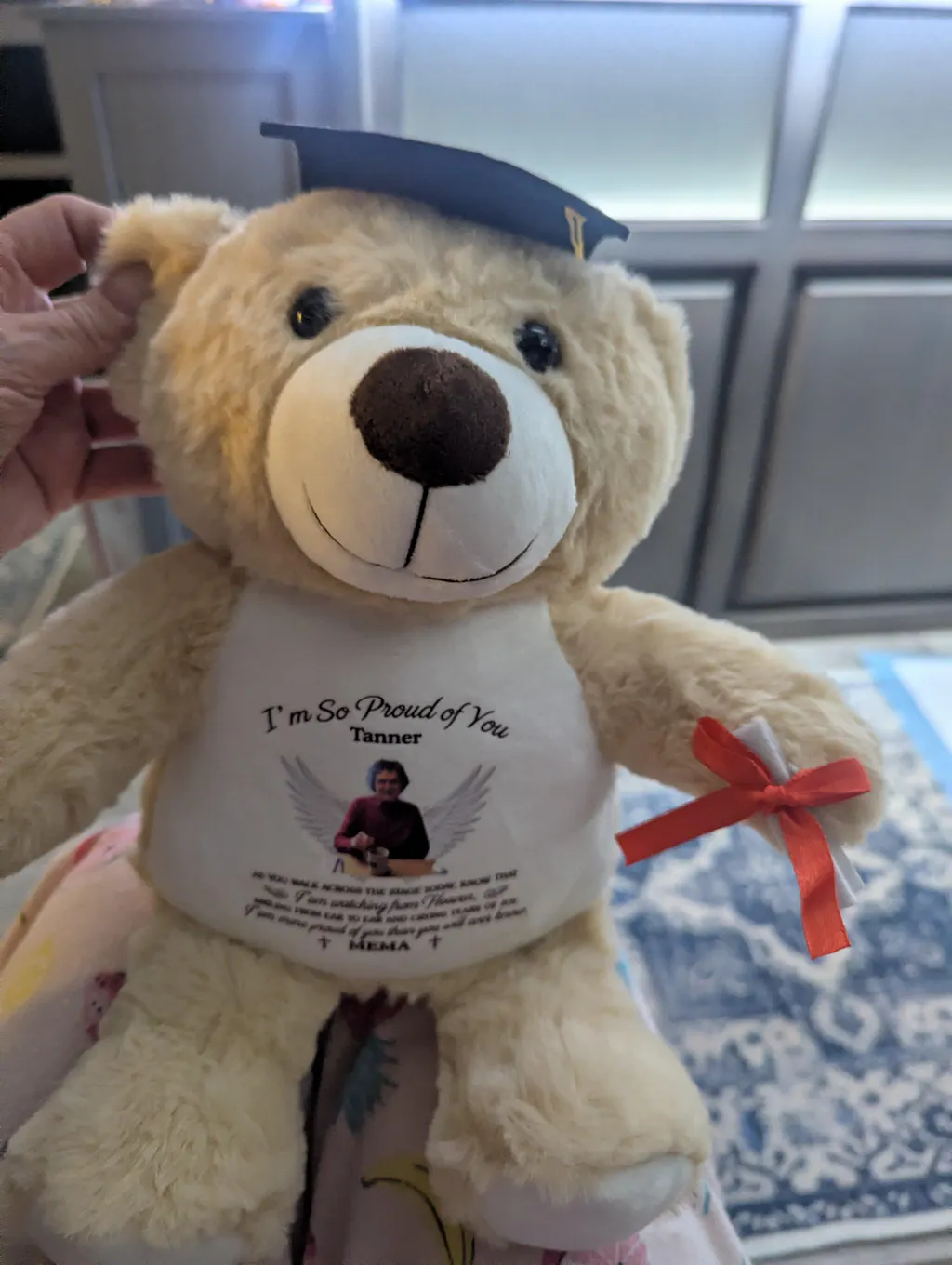 This adorable bear arrived so carefully wrapped. When I opened the box and actually saw it my eyes filled with tears. It was perfect. A graduation morning gift with a reminder that her Poppa who suddenly passed away was watching over her. I was able to personalize it to say " sweetpea" as that's what he called her and love, Poppa just the way she spelled it. From the graduation cap to its feet this bear is precious and perfect.