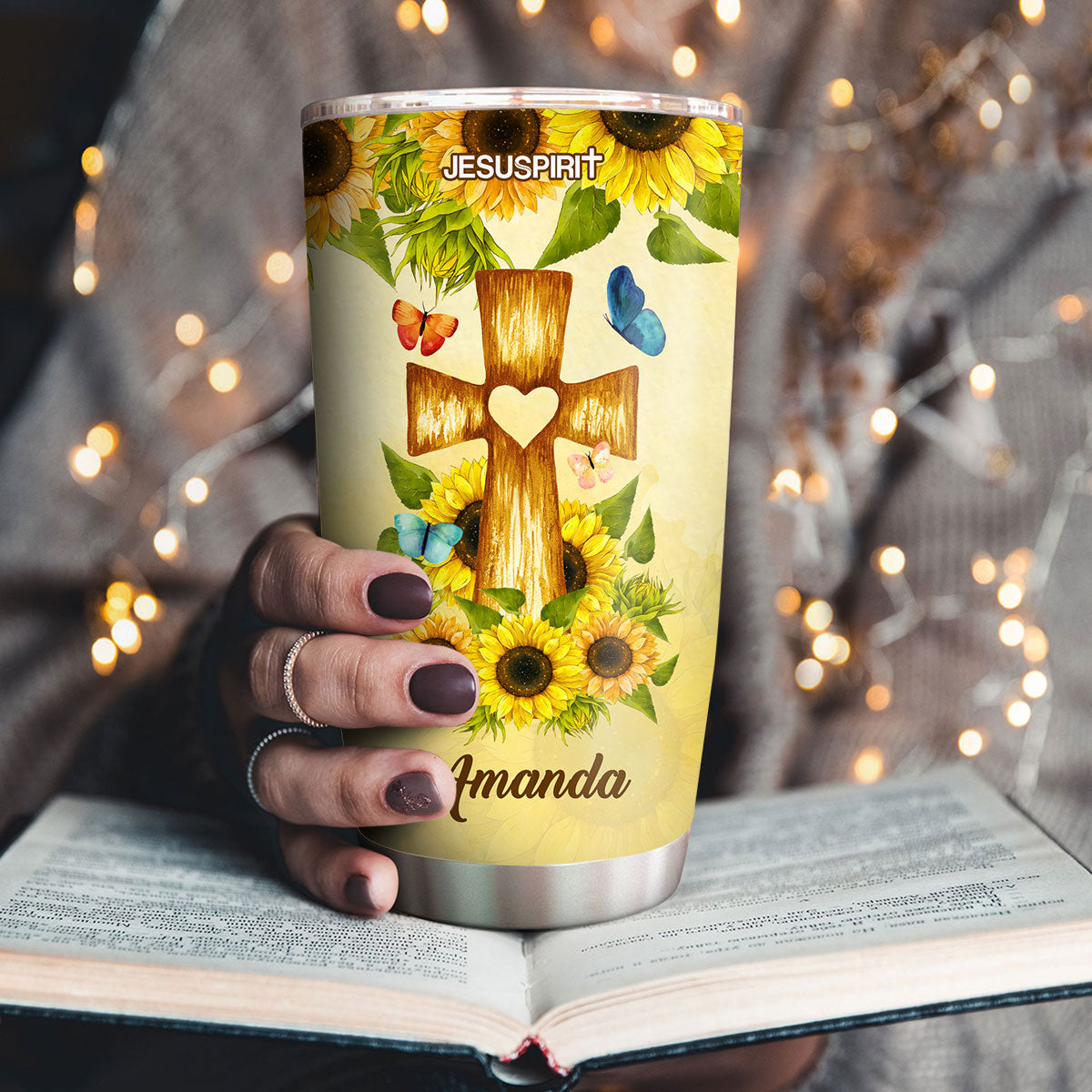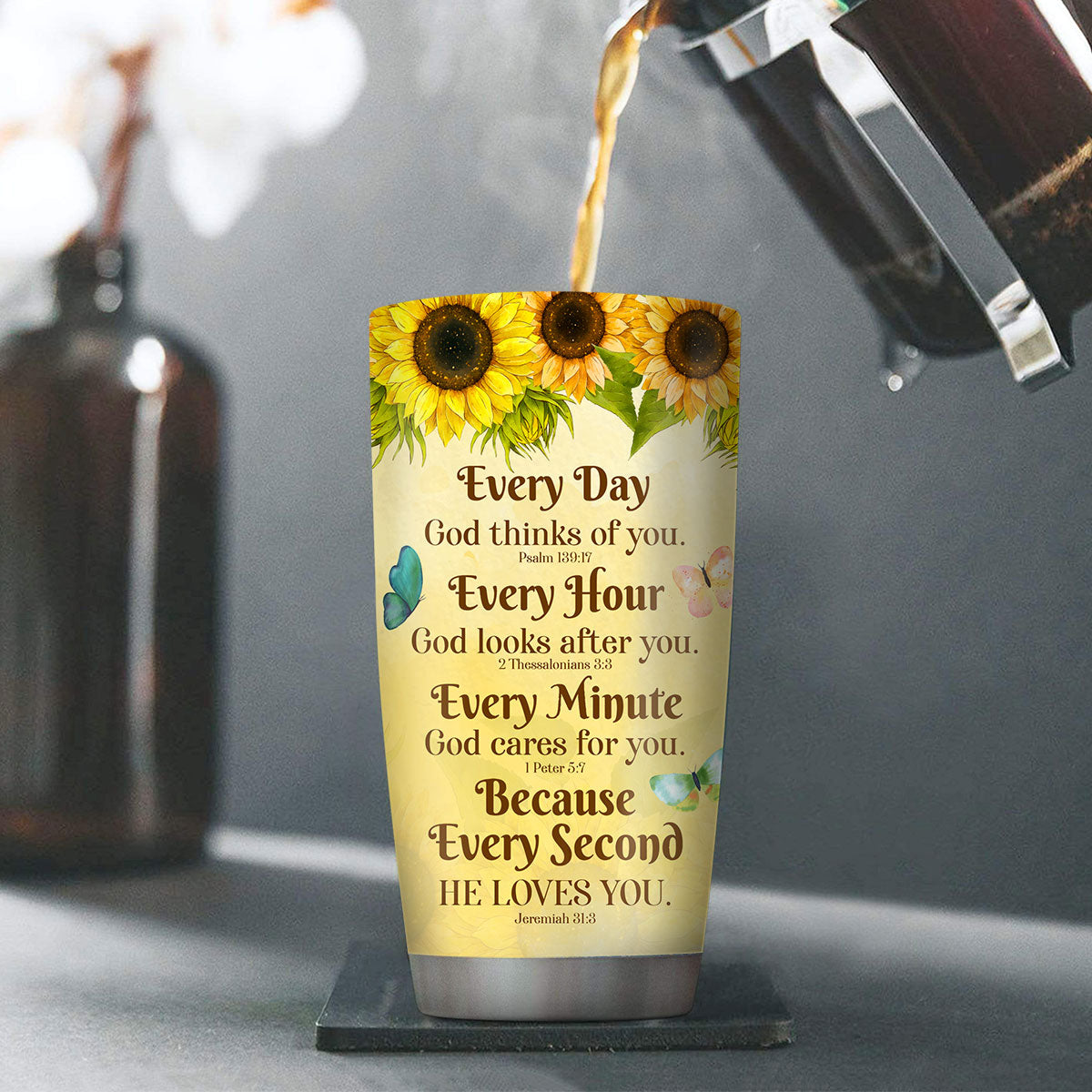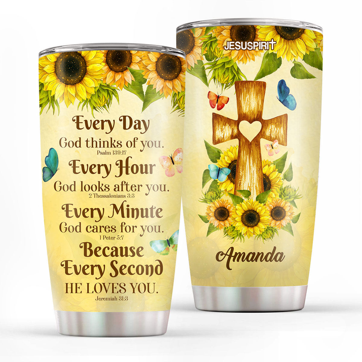 Jesuspirit | Personalized Sunflower Stainless Steel Tumbler 20oz | Everyday God Thinks Of You | Cross And Butterfly SSTHN605
