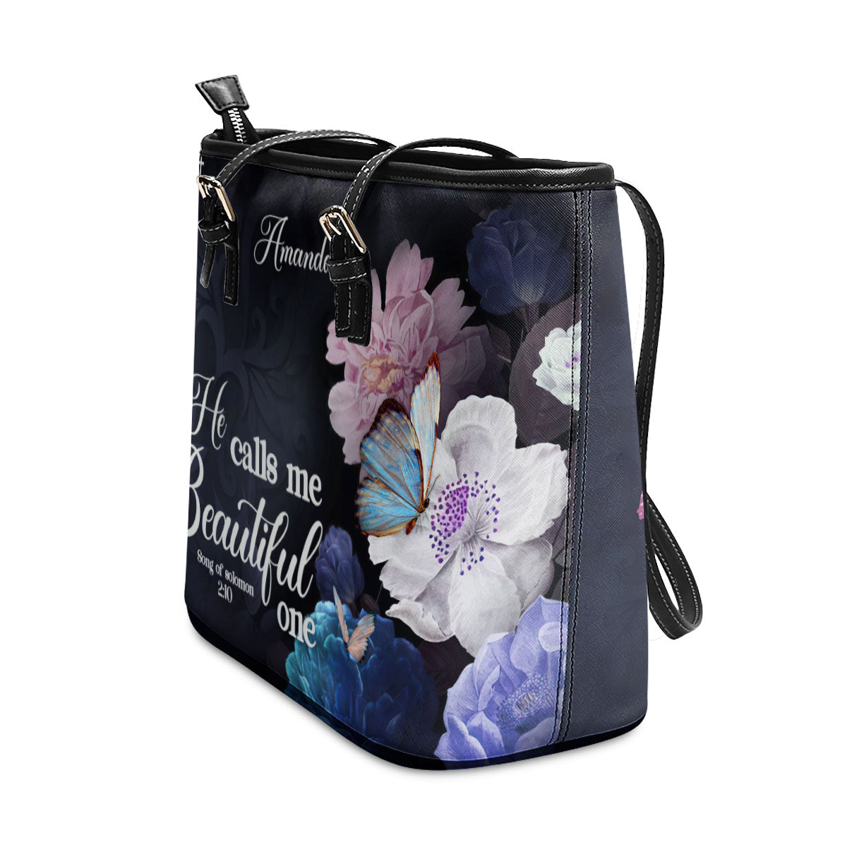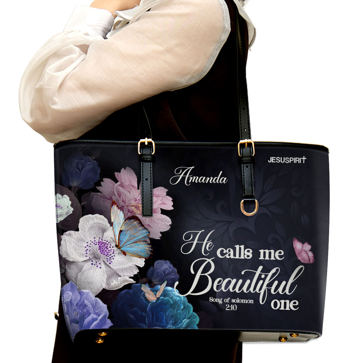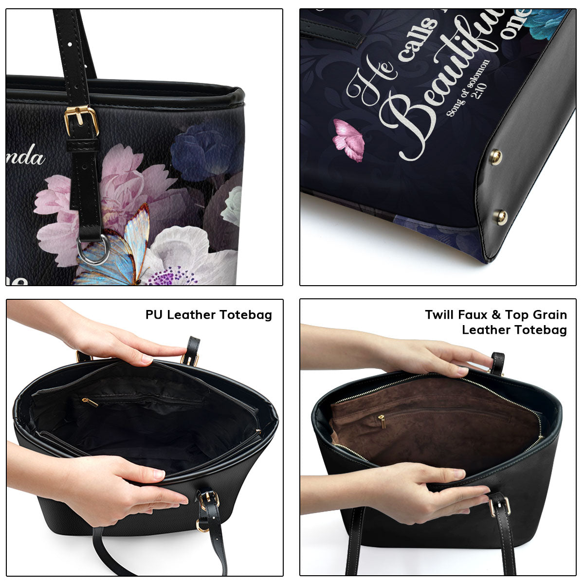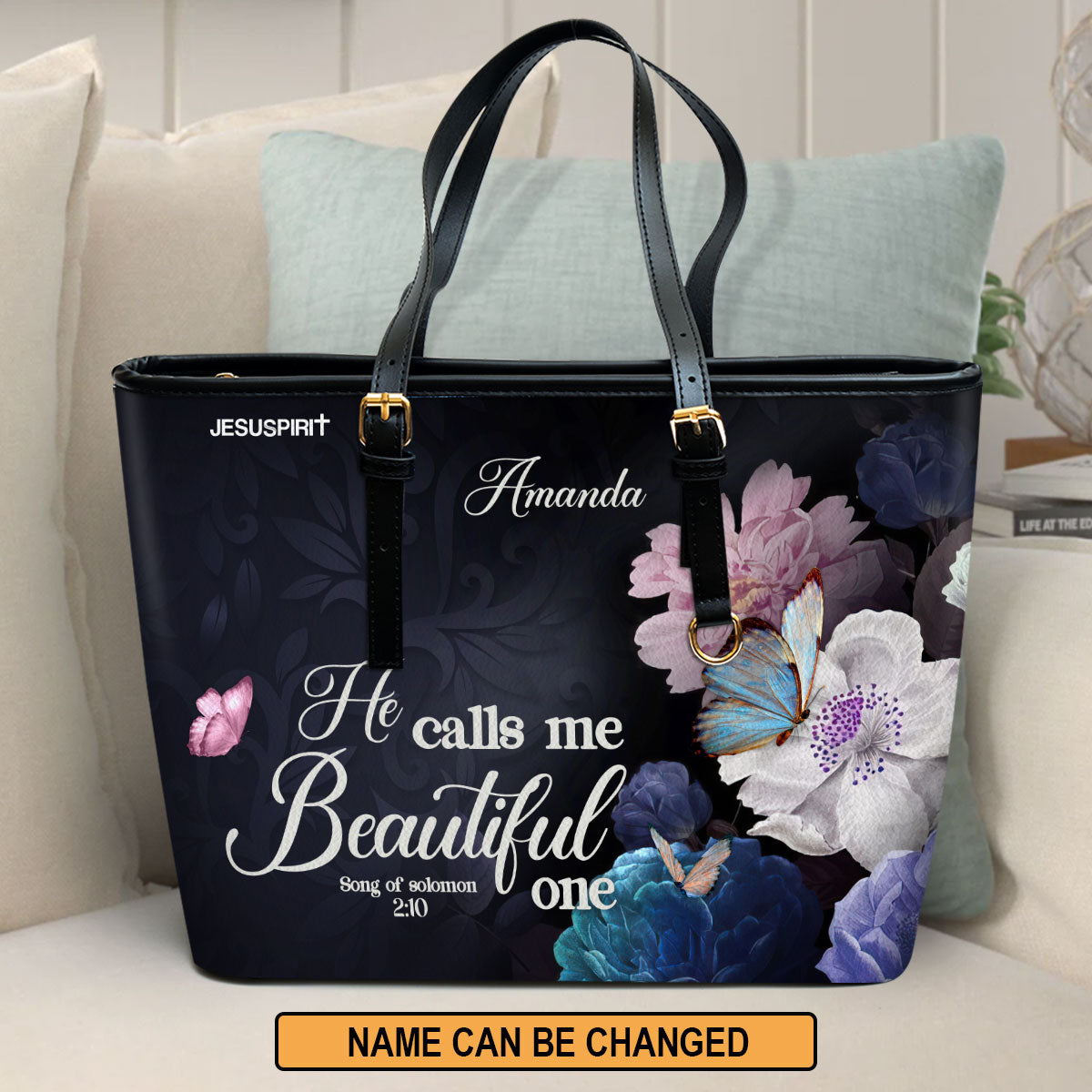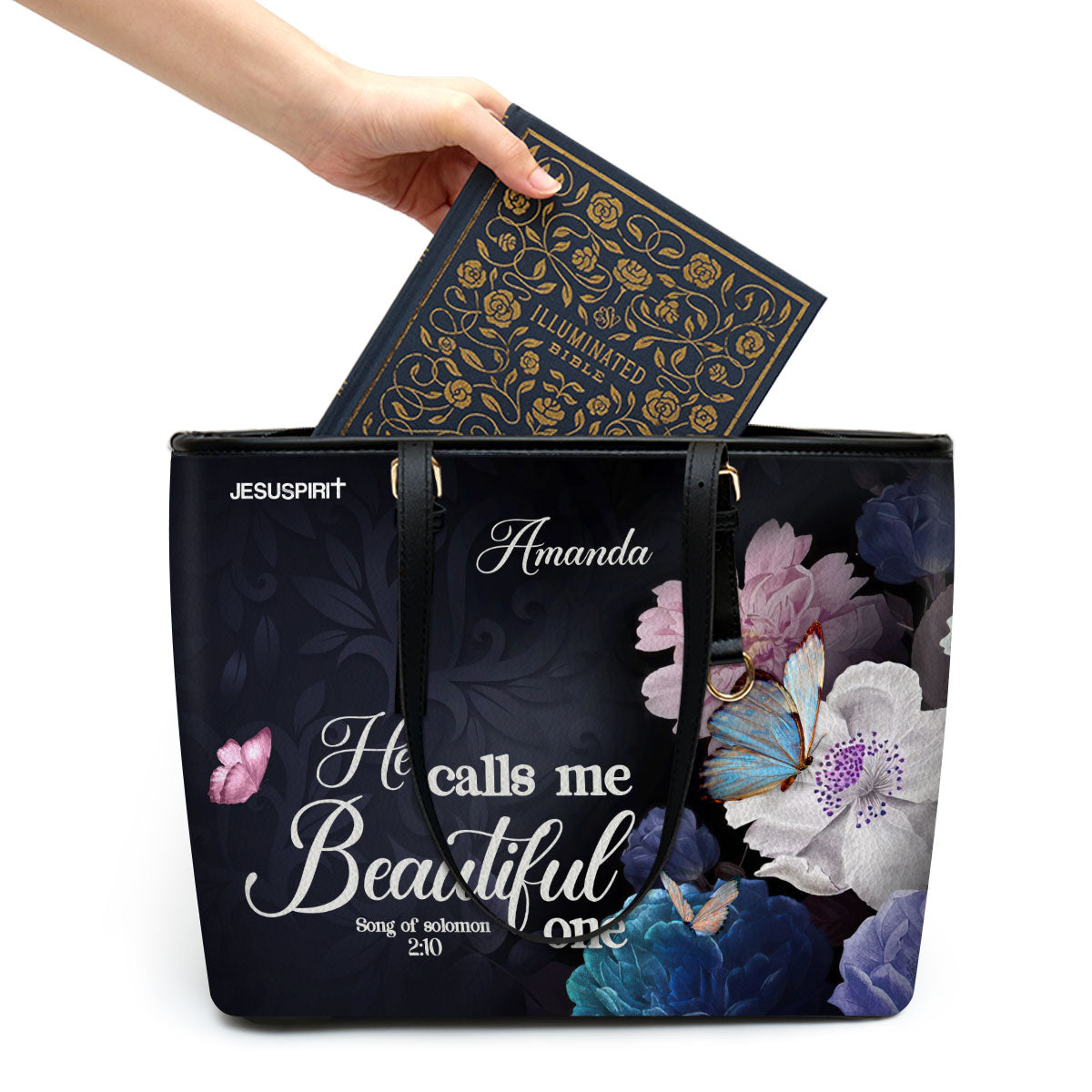 Jesuspirit | Solomon 2:10 | He Calls Me Beautiful One | Personalized Large Leather Tote Bag | Flower And Butterfly LLTBHN645