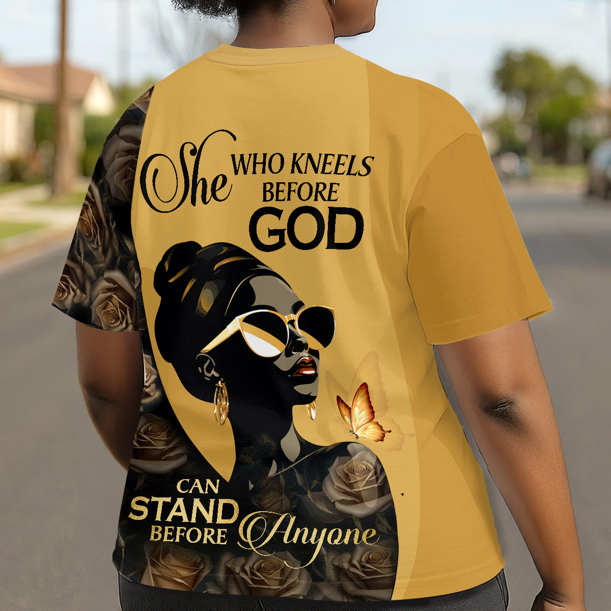 She Who Kneels Before God Can Stand Before Anyone | Personalized All-Over-Print T-Shirt
