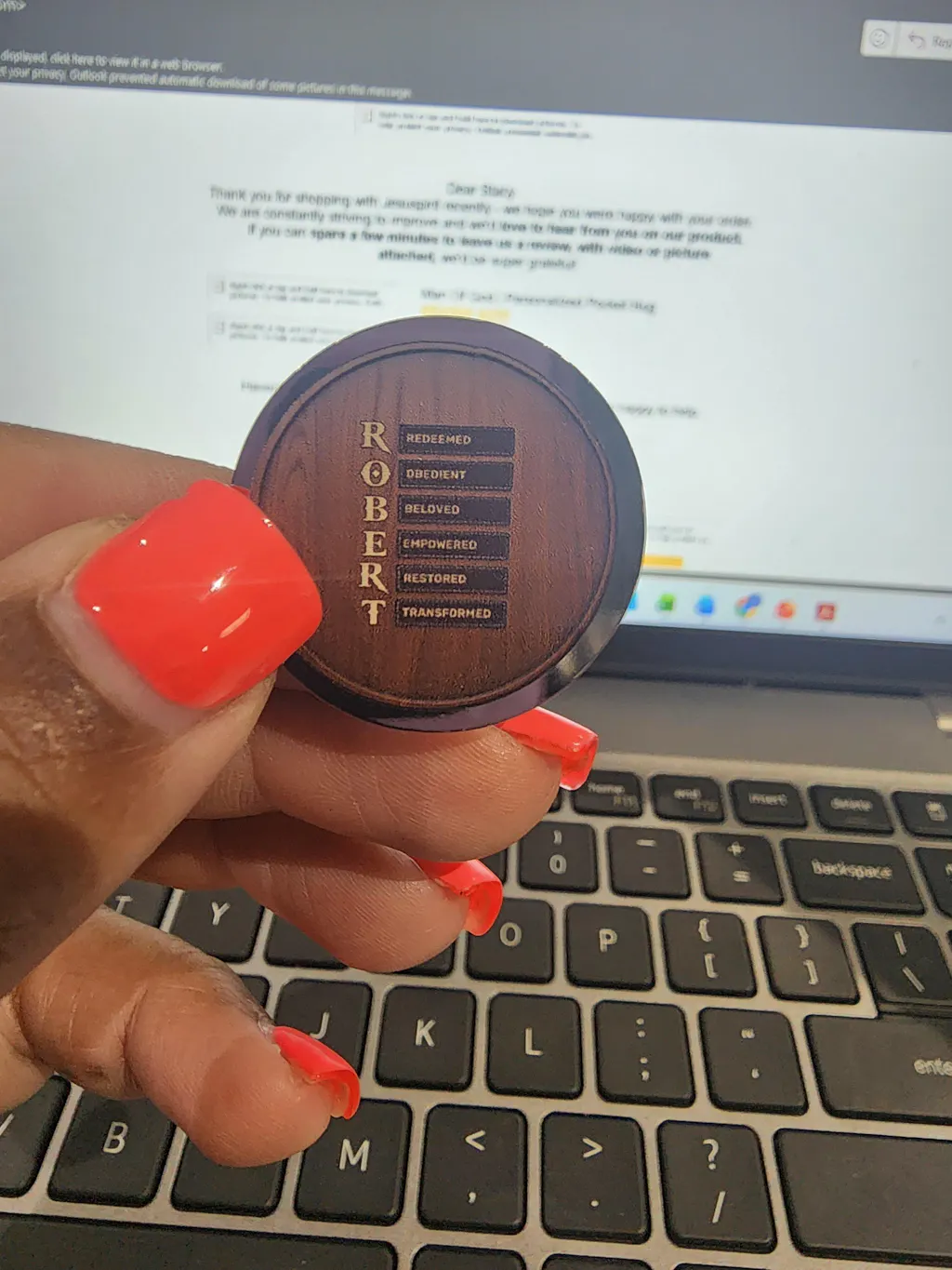 The product I received was nothing like the picture, which appeared to have some dimension. Instead, I got a silver medallion with stickers stuck on each side. The the sticker with the name was so small, the details cant be read. Very disappointed with this purchase.