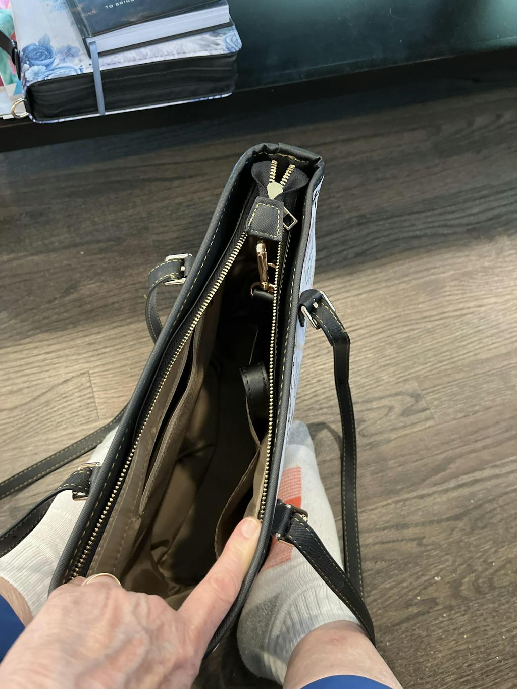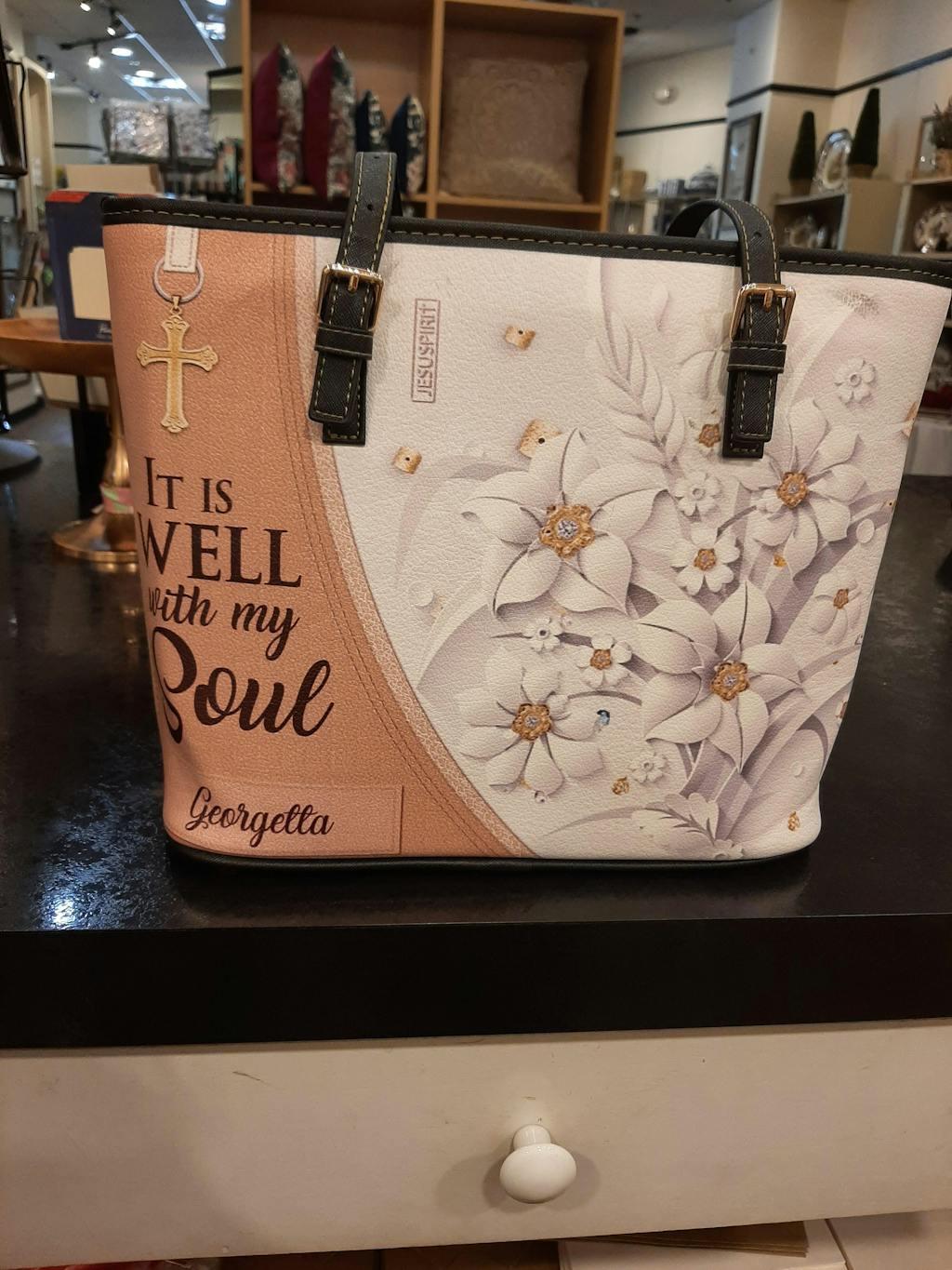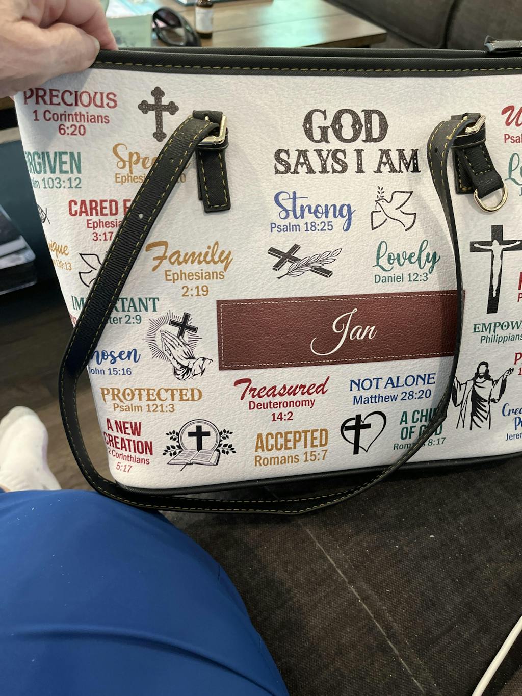 High quality and beautiful. Has pockets for items and lots of space. Like the base with “feet” to keep it off of the ground or floor. Love that I can take my Bible and purse contents in one bag with room for notebook and pens.